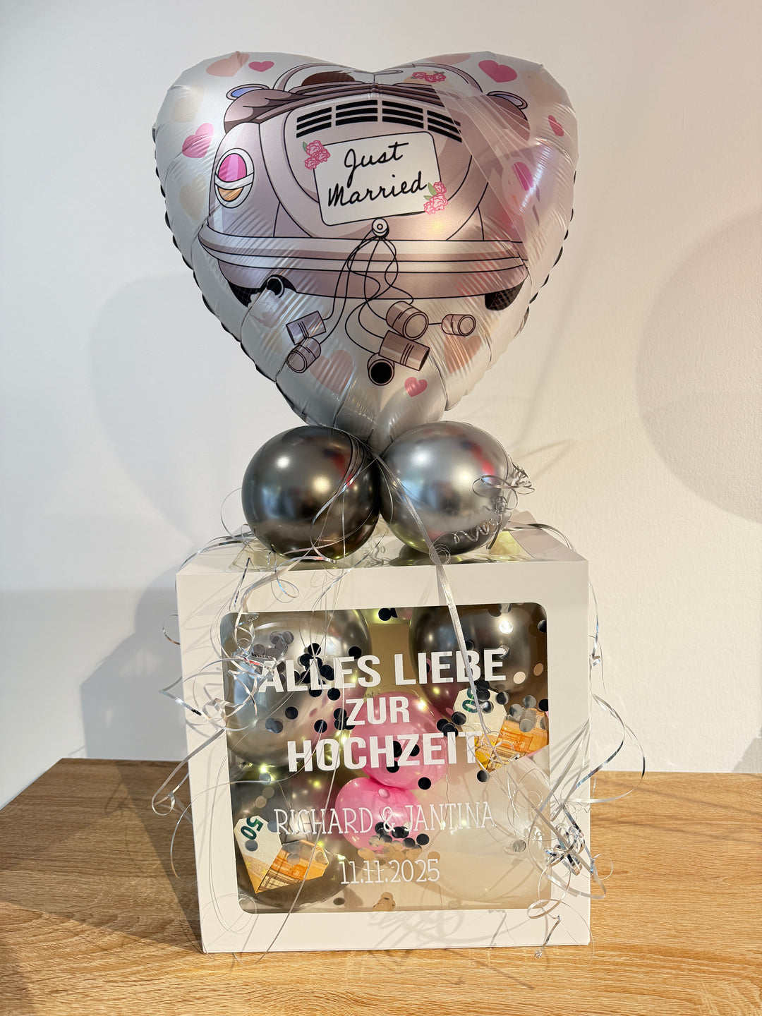 Verschenken Sie Geld als Geldgeschenk in unserer schönen Ballonbox oder auch Geschenkbox an das Hochzeitspaar und personalisieren Sie die Box mit den Namen des Hochzeitspaares. Ganz persönliche Glückwünsche.